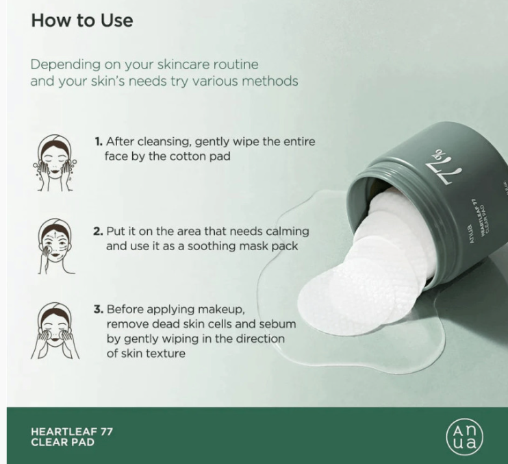 Transforme ta routine en un geste simple mais complet avec le Heartleaf 77 % Clear Pad d’Anua. Ce pad imbibé d’un extrait botanique de heartleaf (77 %) combine les effets purifiants, apaisants et hydratants en une seule étape. Grâce à la douceur de la gluconolactone (PHA), il exfolie les cellules mortes sans agresser, tandis que les extraits végétaux comme Centella Asiatica, Camellia Sinensis ou Portulaca Oleracea apaisent et protègent. Il aide à resserrer les pores, à réguler l’excès de sébum, à améliorer la texture de la peau, tout en apportant une sensation de fraîcheur. Parfait pour les peaux sensibles, mixtes à grasses, ou celles qui cherchent à simplifier leur routine sans compromis.